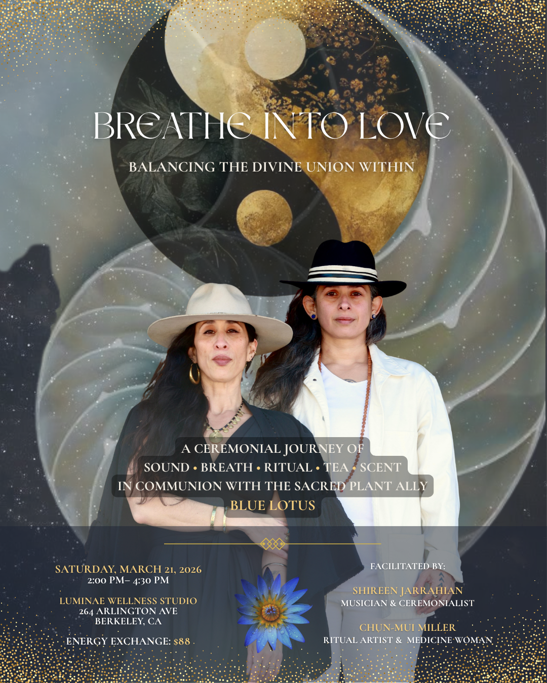 Breathe Into Love is a ceremonial sound journey weaving breath, sound, ritual, tea, and scent into a multi-sensory experience designed to guide you into deep presence, inner harmony, and heart-centered awareness. Together we will enter into relationship with Blue Lotus — an ancient plant ally revered since the time of Ancient Egypt and long associated with dream manifestation, divine union, and expanded states of consciousness. Shared ceremonially as tea, Blue Lotus becomes a gentle guide into subtle heart opening, intuitive vision, and inner union.